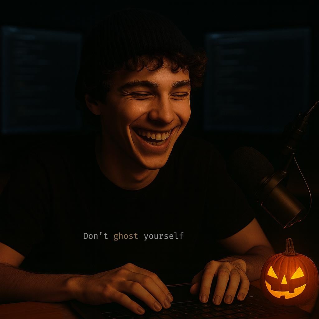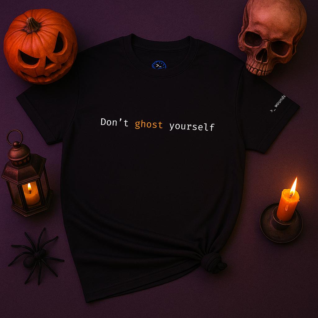 Part of the Wounded Healers drop by Skye Syntax — a seasonal capsule that blends vulnerability with courage and a touch of dark humour. Each design plays with the language of fear and code alike, reminding you that ghosts fade when faced, masks come off in the light, and even the scariest feelings lose power once named. Soft, minimal, and quietly rebellious — made for those who’d rather debug their demons than hide from them.